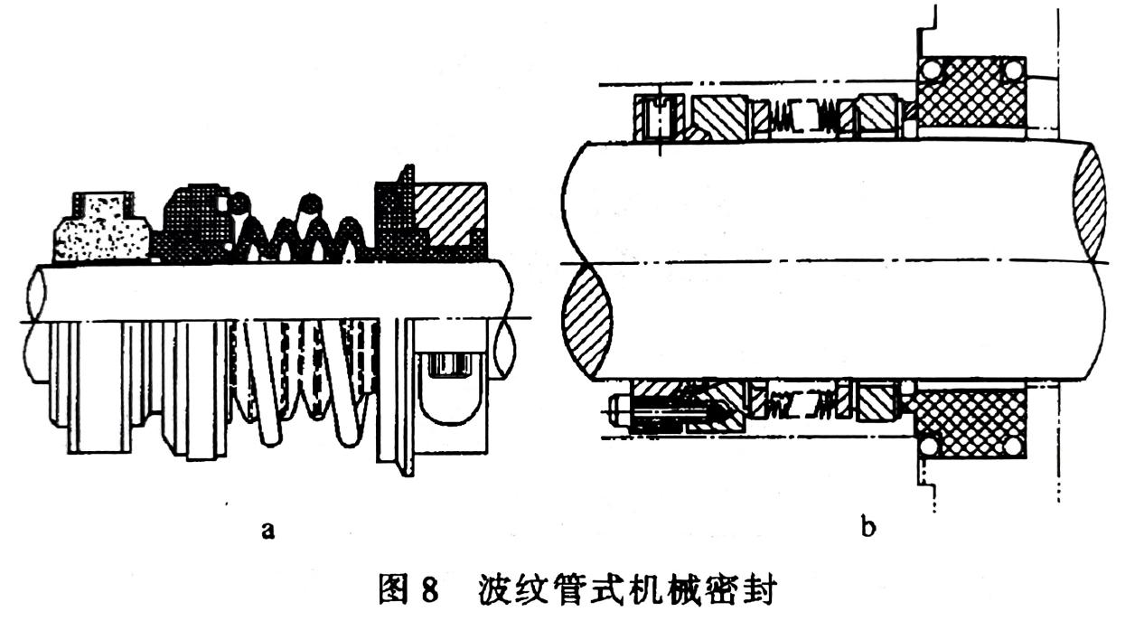 補償結構為波紋管,其中一個密封環(動環或靜環)和波紋管制成一個完整體,其中不含有輔助密封圈(見圖8),所以減少了一個泄漏點;同時減少了補償結構的摩擦阻力,優化了追隨性;對于焊接金屬波紋管密封(圖8b)運行溫度不受輔助密封圈的影響限制;對于四氟波紋管密封(圖8a)可用于腐蝕性介質中。其缺點是有的波紋管彈力較小,需要額外附加彈簧進行輔助補償,如(圖8a)所示。