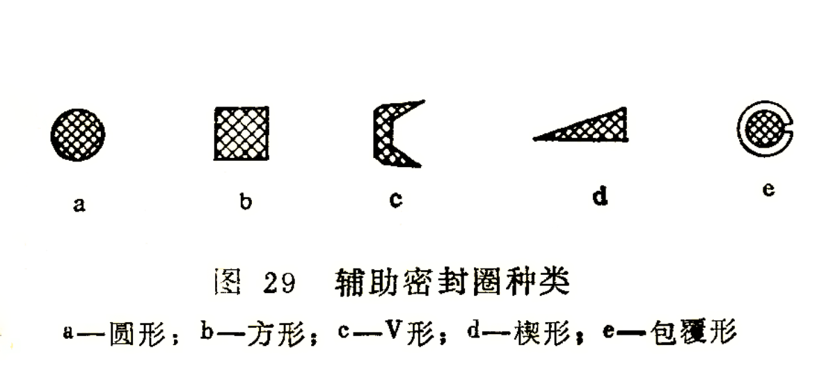 動環和軸(軸套)以及靜環和壓蓋之間的密封靠輔助密封圈來實現。它們基本上歸于靜密封,當密封端面和軸中心線不垂直時,動環密封圈沿軸向有很小的運動位移,其移動量取決于密封端面和軸中心的垂直度誤差、運動的次數和軸轉速等。輔助密封圈的種類有很多,從材質角度分類有合成橡膠、聚四氟乙烯和柔性石墨等;從斷面形狀分類有圓形、方形、V形、楔形及包覆形密封圈(圖29)。