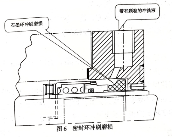 ◆原因分析過高的沖洗速度或沖洗孔的位置不當,以及沖洗液中含有顆粒都可能使密封環受到沖刷磨損(圖6)。