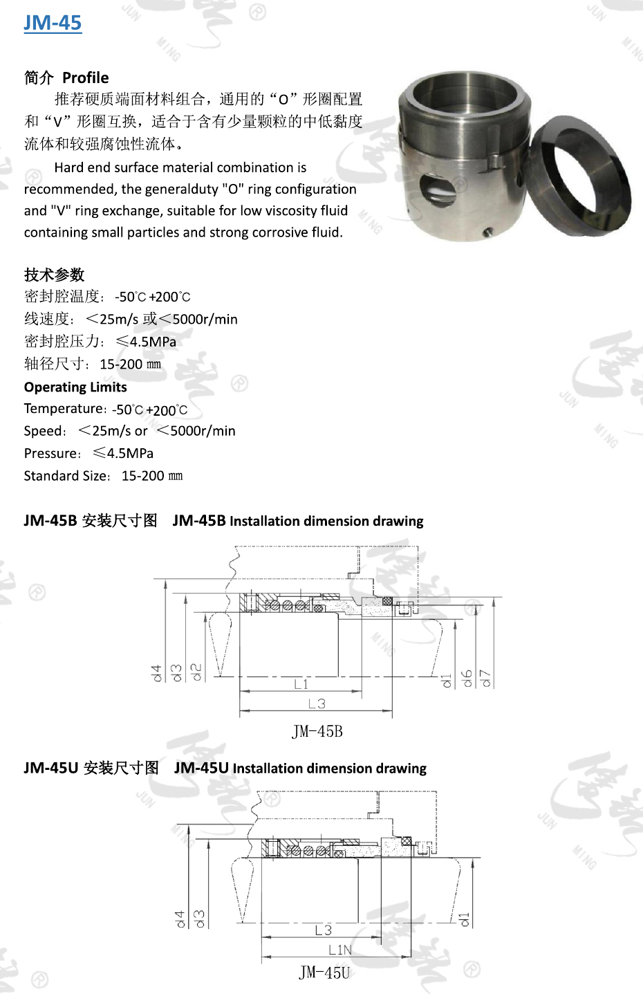 推薦硬質端面材料組合,通用的“O”形圈配置和“V”形圈互換,適合于含有少量顆粒的中低黏度流體和較強腐蝕性流體。