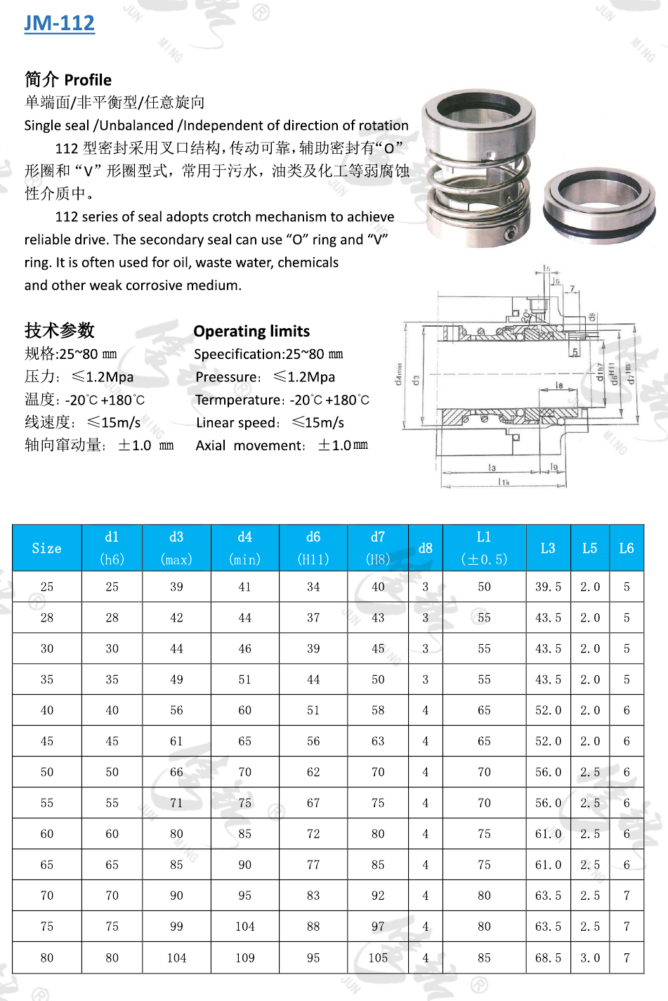 單端面/非平衡型/任意旋向。 112型密封采用叉口結構,傳動可靠,輔助密封有“O”形圈和“V”形圈型式,常用于污水,油類及化工等弱腐蝕性介質中。