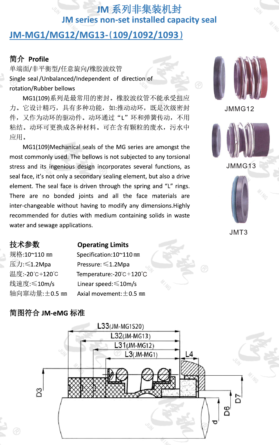 單端面/非平衡型/任意旋向/橡膠波紋管。 MG1(109)系列是最常用的密封。橡膠波紋管不能承受扭應力。它設計精巧,具有多種功能,如:推動動環,既是次級密封件,又作為動環的驅動件。動環通過“L”環和彈簧傳動,不用粘結。動環可更換成各種材料。可在含有顆粒的廢水,污水中應用。