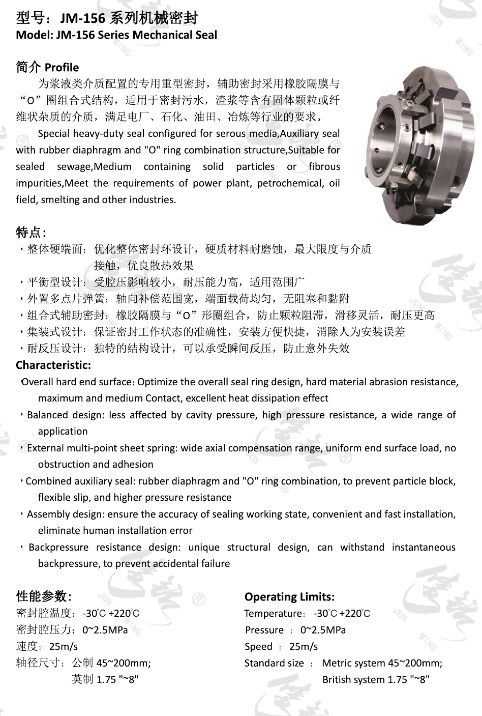為漿液類介質配置的專用重型密封,輔助密封采用橡膠隔膜與“O”圈組合式結構,適用于密封污水,渣漿等含有固體顆粒或纖維狀雜質的介質,滿足電廠、石化、油田、冶煉等行業的要求。