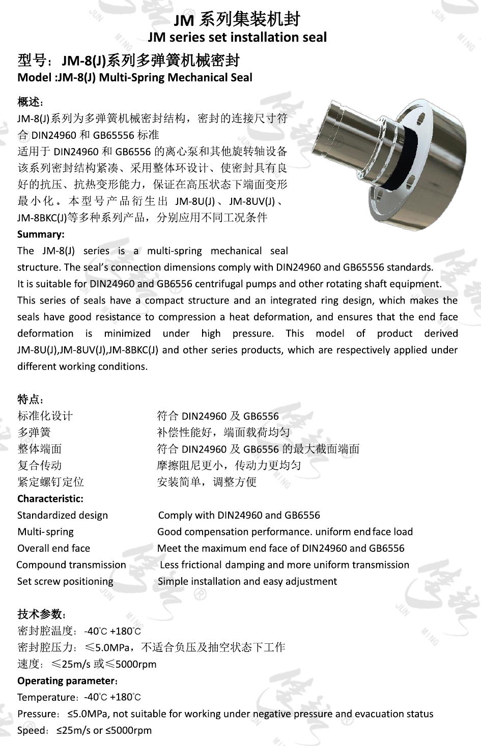 JM-8(J)系列為多彈簧機械密封結構,密封的連接尺寸符合DIN24960和GB65556標準 適用于DIN24960和GB6556的離心泵和其他旋轉軸設備 該系列密封結構緊湊、采用整體環設計、使密封具有良好的抗壓、抗熱變形能力,保證在高壓狀態下端面變形最小化。本型號產品衍生出JM-8U(J)、JM-8UV(J)、JM-8BKC(J)等多種系列產品,分別應用不同工況條件