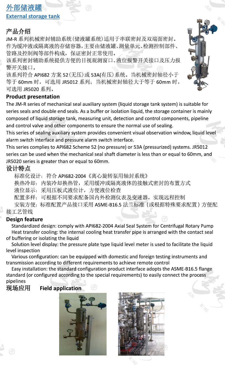 JM-R系列機械密封輔助系統(儲液罐系統)適用于串聯密封及雙端面密封。作為緩沖液或隔離液的存儲容器,主要由儲液罐、測量單元、檢測控制部件、管路及控制閥等部件構成,保證密封正常使用。 該系列密封輔助系統提供方便的目視觀測窗口、液位報警開關接口及壓力報警開關接口。 該系列符合API682方案52(無壓)或53A(有壓)系統。當機械密封軸徑小于等于60mm時,可選用JR5012系列;當機械密封軸徑大于等于60mm時,可選用JR5020系列。