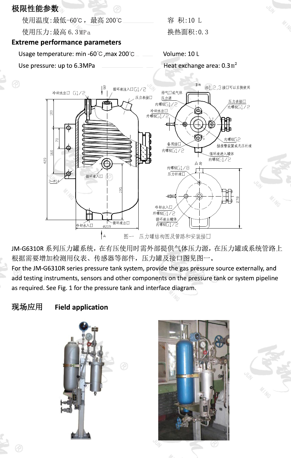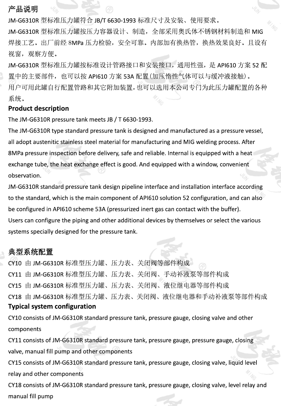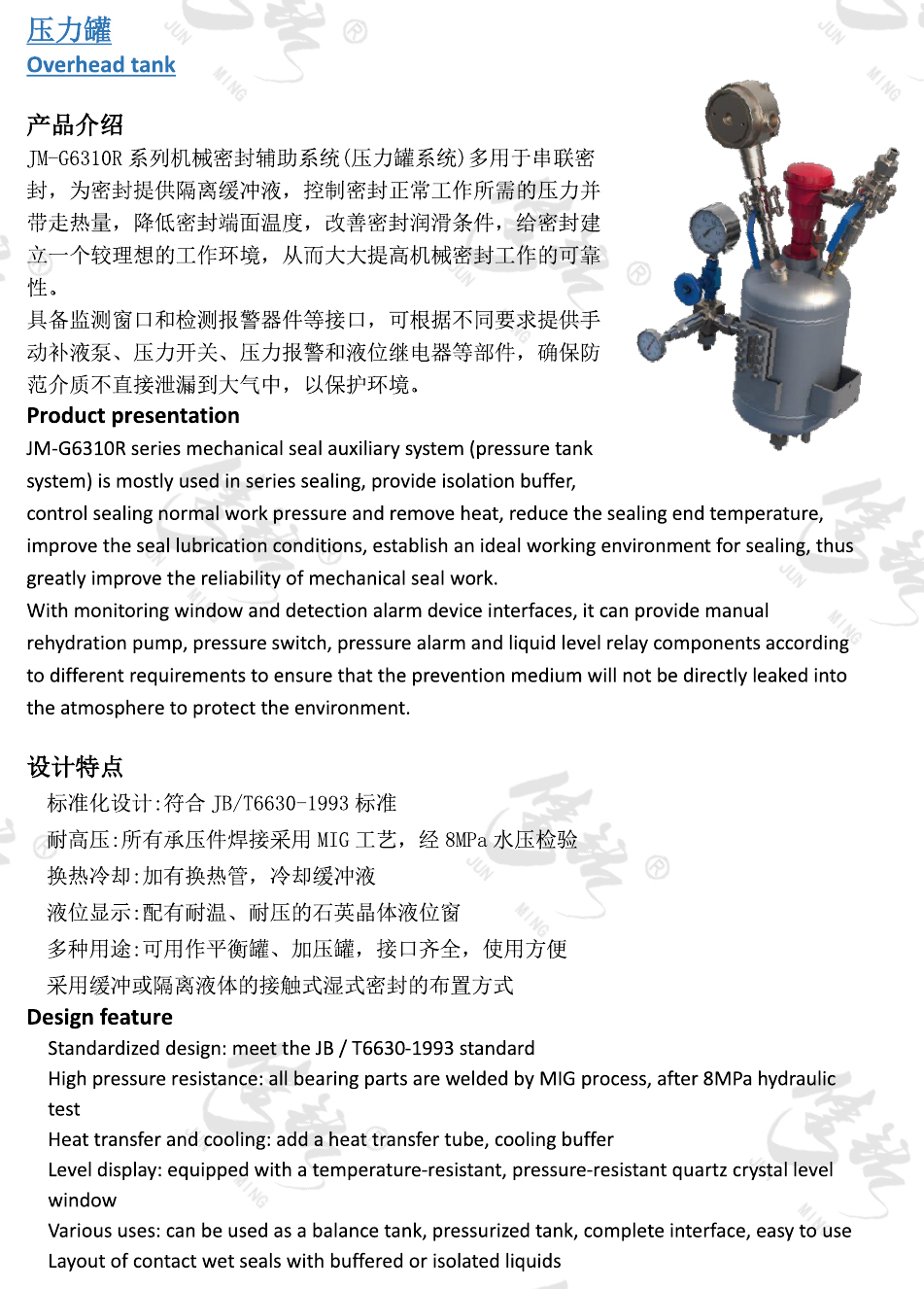 JM-G6310R系列機械密封輔助系統(壓力罐系統)多用于串聯密封,為密封提供隔離緩沖液,控制密封正常工作所需的壓力并帶走熱量,降低密封端面溫度,改善密封潤滑條件,給密封建立一個較理想的工作環境,從而大大提高機械密封工作的可靠性。 具備監測窗口和檢測報警器件等接口,可根據不同要求提供手動補液泵、壓力開關、壓力報警和液位繼電器等部件,確保防范介質不直接泄漏到大氣中,以保護環境。
