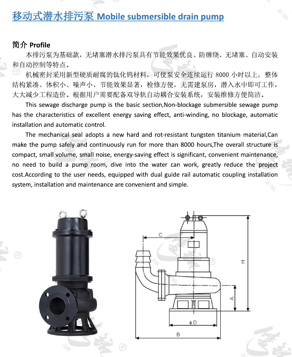 本排污泵為基礎款,無堵塞潛水排污泵具有節能效果優良、防纏繞、無堵塞、自動安裝和自動控制等特點。 機械密封采用新型硬質耐腐的鈦化鎢材料,可使泵安全連續運行8000小時以上;整體結構緊湊、體積小、噪聲小、節能效果顯著,檢修方便,無需建泵房,潛入水中即可工作,大大減少工程造價。根據用戶需要配備雙導軌自動耦合安裝系統,安裝維修方便簡潔。