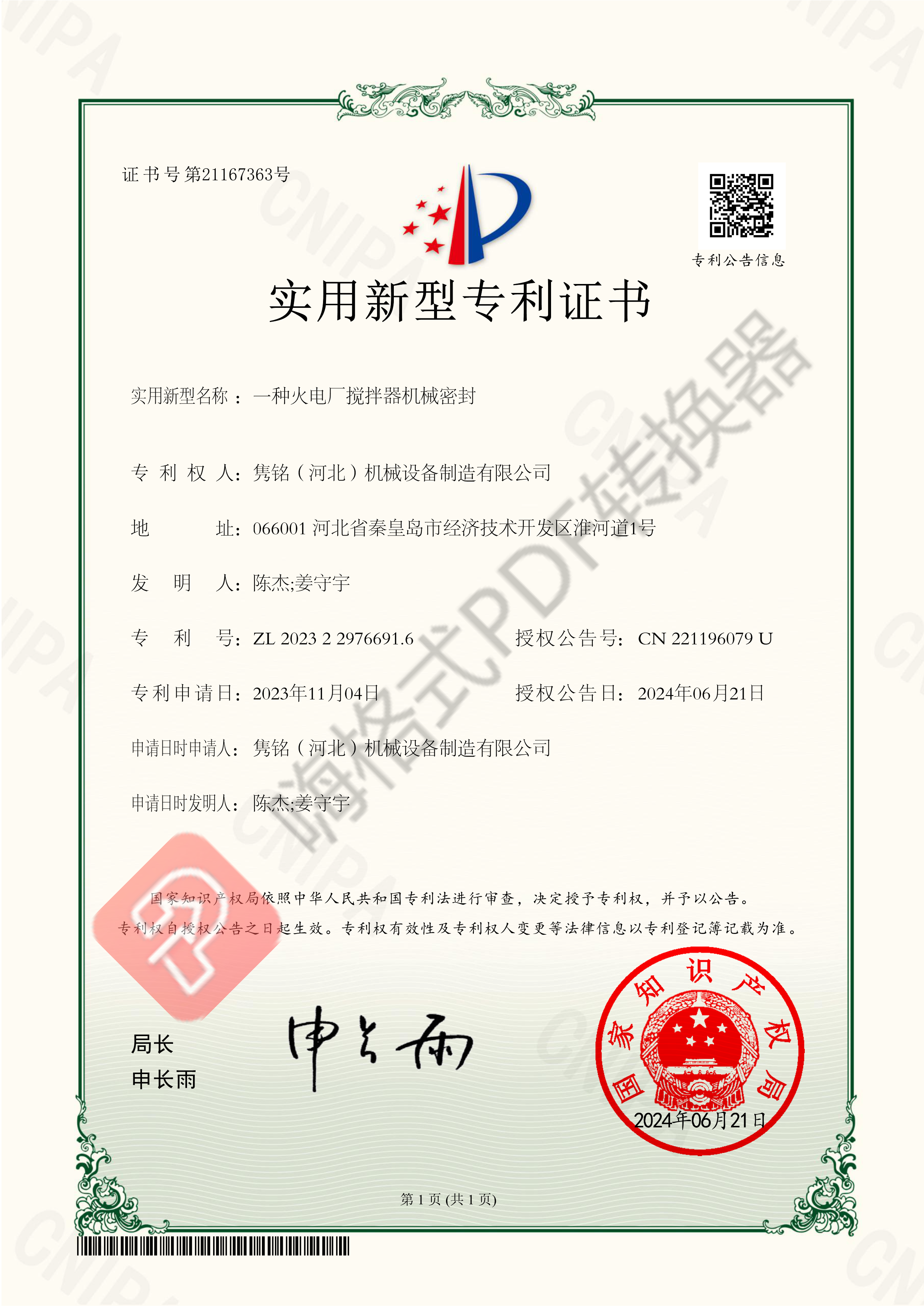 熱烈祝賀我公司研發的一種火電廠攪拌器機械密封,于2024年6月21日獲國家知識產權局發明專利授權!專利號ZL 2023 2 2976691.6。